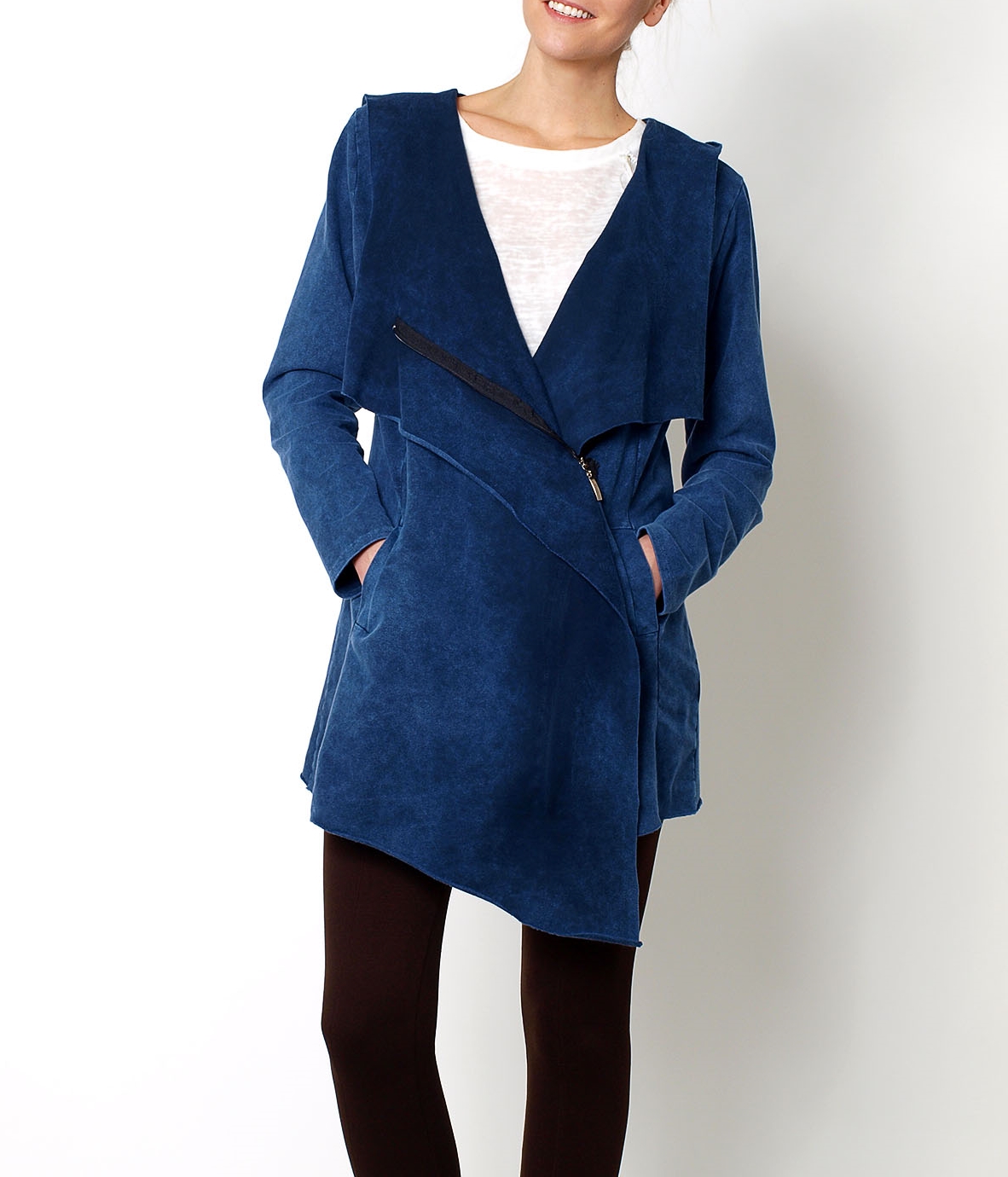 Narzutka z kapturem, dekatyzowana, zapiana z przodu na zamek, z przodu kieszenie, surowe wykończenie, kołnierz typu waterfall, przód dłuższy.Modelka wzrost 175cm, na co dzień nosi S/M, rozmiar z prezentacji produktu uniwersalny