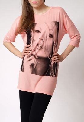 Luźna bluzka typu nietoperz. Modny szeroki krój. Z przodu nadruk przedstawiający postać kobiety. Okrągły dekolt. Rękawki o długości 3/4. Elastyczny, dopasowujący się do sylwetki materiał. Wygodna i komfortowa tunika. Świetnie prezentuje się noszona w zestawieniu z jeansami, jak i gładkimi legginsami.Skład: 95% wiskoza, 5% elastan