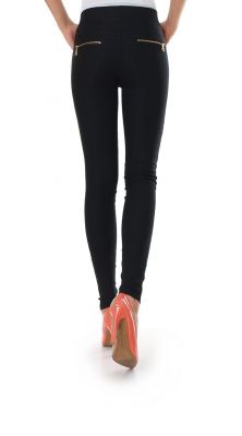 Wygodne jak legginsy czarne spodnie. Elastyczne rurki, idealnie dopasowują się do figury. Z przodu kieszenie, z tyłu ozdobne, złote zameczki (imitacja kieszeni). Zawsze modne, niezwykle praktyczne spodnie. Wewnątrz ocieplane delikatnym meszkiem, dzięki czemu świetnie sprawdzą się noszone w chłodniejsze dni. Skład: 35% bawełna, 65% poliester