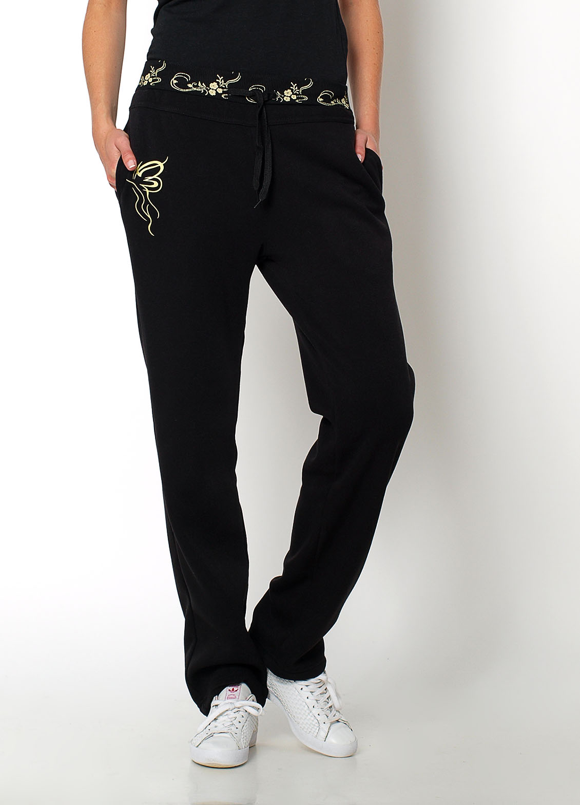 Ocieplane spodnie dresowe, w środku z meszkiem, w pasie gumka i sznurek do regulacji, na biodrze i na pasie szlaczek w kwiatowy wzór. prosta nogawka, kieszenie po bokach.Materiał 65% bawełna, 35% poliesterModelka wzrost 175cm, na co dzień nosi S/M, rozmiar z prezentacji produktu M.
