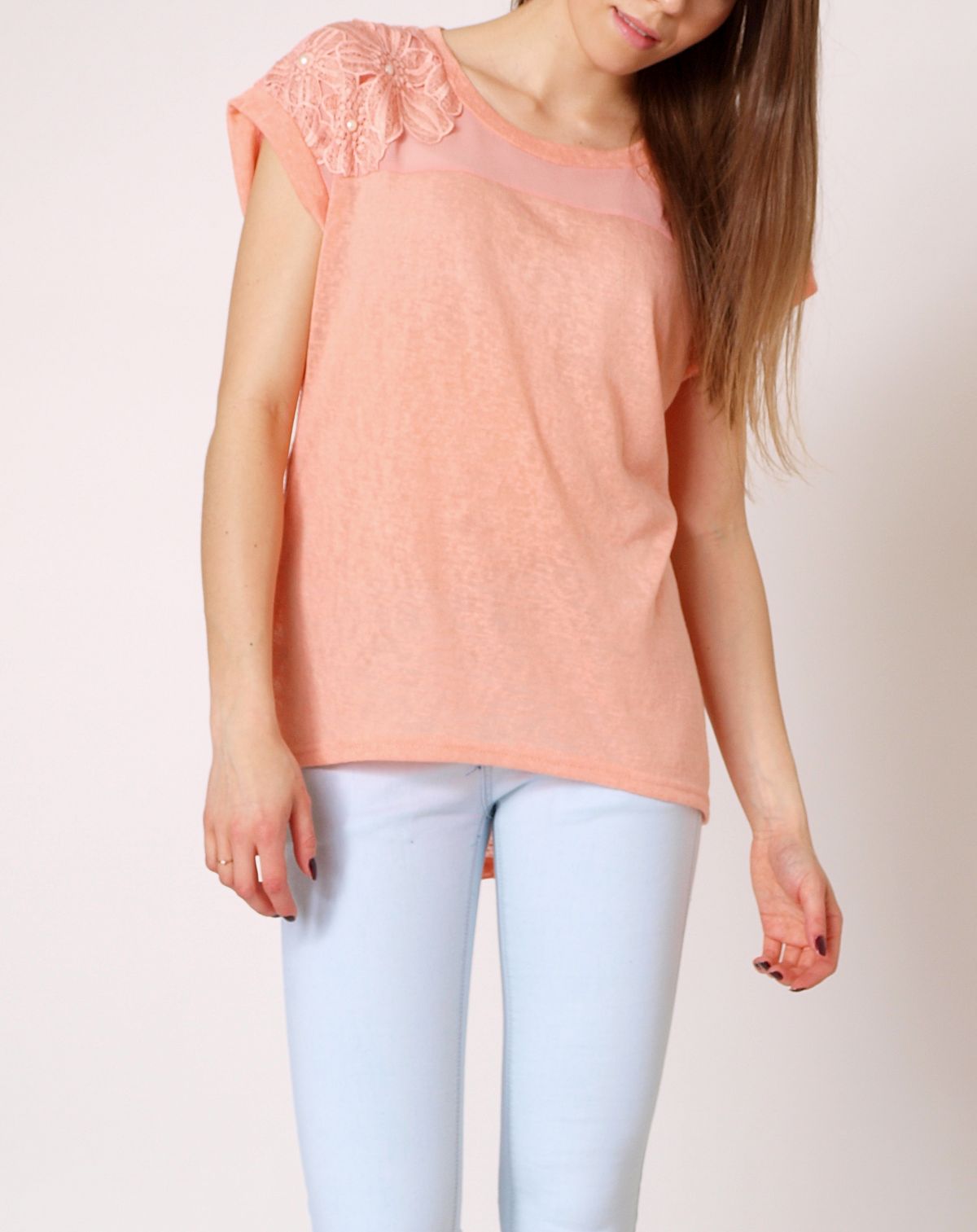 Śliczna asymetryczna bluzeczka. Tył delikatnie dłuższy. Ramiona szyfonowe, zdobione wyszywanymi kwiatami, wykończonymi białymi perełkami. Na plecach zapinana na złoty zamek. Materiał miły w dotyku. Dobrze skrojona. Luźny, bardzo modny w tym sezonie fason. Stylowa bluzeczka w pastelowych kolorach, która znakomicie dopełni wiele wiosennych, jak również letnich stylizacji.Skład: 65% bawełna, 35% poliester.