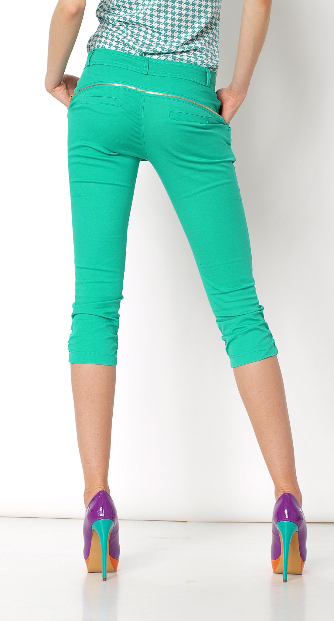 Komfortowe spodnie za kolano. Zapinane na zamek oraz guzik. Bawełniane rybaczki z efektownym, złotym zamkiem nad pośladkami. Z przodu funkcjonalne kieszenie, z tyłu imitacje. W pasie szlufki. Nogawki drapowane, podszyte gumeczką. Krótkie cygaretki, ładnie prezentują się na sylwetce, doskonale wysmuklają nogi. Bardzo praktyczny model, który sprawdzi się noszony na wiele okazji. Pasuje zarówno do codziennych, jak również tych bardziej wyszukanych, eleganckich stylizacji.Skład: 95% bawełna, 5% elastan.Wzrost modelki: 172cmModelka ma na sobie: rozmiar z metki SNa co dzień nosi rozmiar: S/M