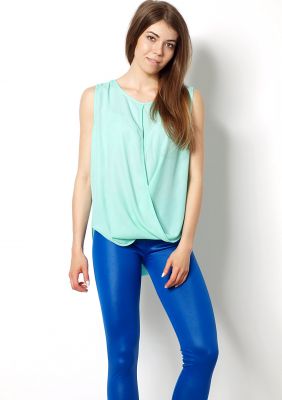 Niepowtarzalna szyfonowa bluzka o ciekawym kroju bombki. Niezwykle zwiewna, delikatna i bardzo kobieca. Półprzeźroczysta mgiełka bez rękawów, z głębokim wycięciami z przodu i na plecach. Tył delikatnie dłuższy. Na górze zapinana na guziczek. Lekki materiał, doskonale układa się na sylwetce. Dzięki luźnemu fasonowi, pasują do każdej figury. Wyśmienicie ukryje również drobne jej niedoskonałości. Idealna do pracy, na co dzień, a także w wersji wieczorowej, do wielu eleganckich stylizacji.Skład: 100% poliester.Wzrost modelki: 172cmNa co dzień nosi rozmiar: S/M