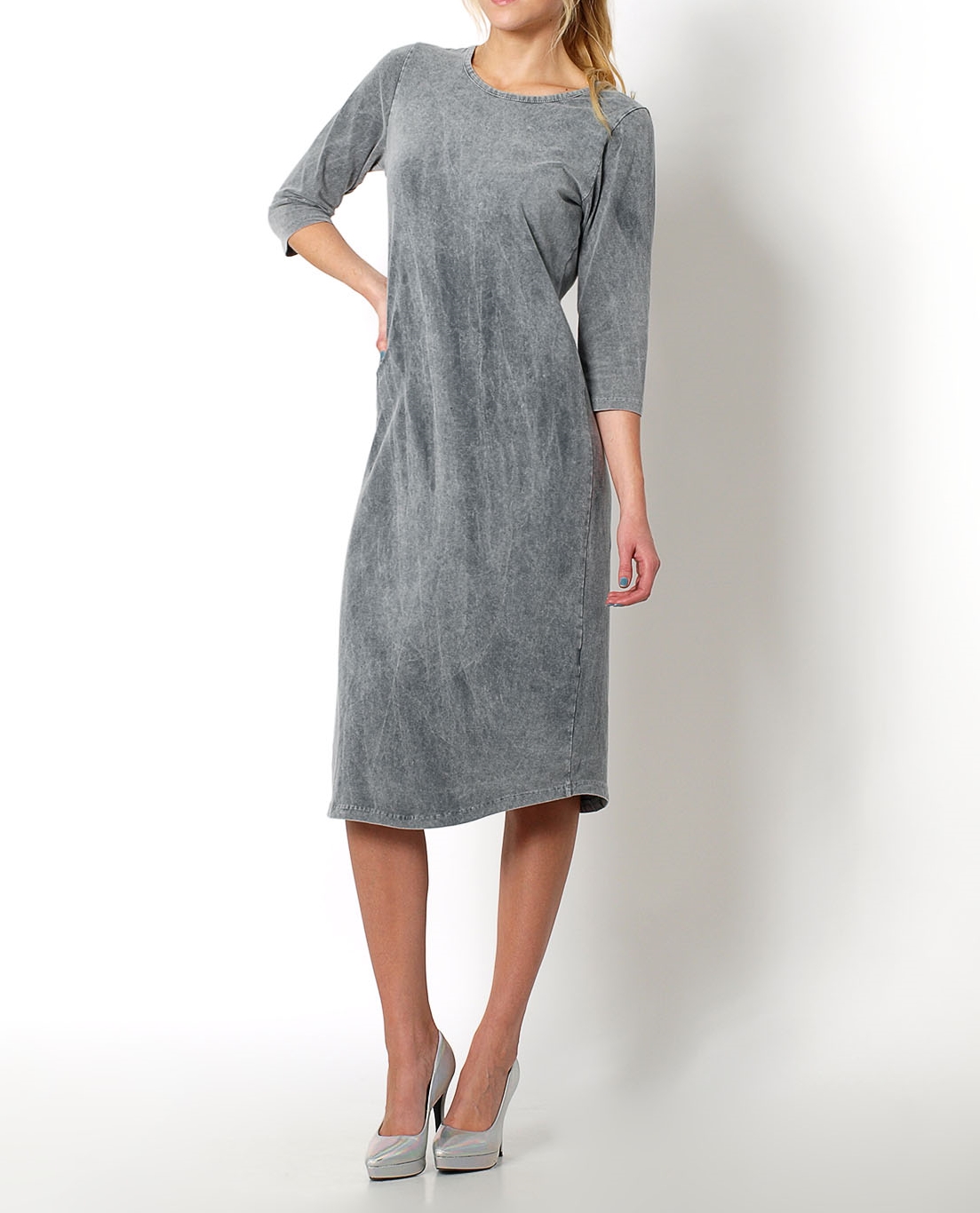 Sukienka o prostym kroju, długość do łydki. Dekolt okrągły, rękawy 3/4. Uwaga! Odcienie sukienek mogą różnic się nieznacznie od prezentowanych na zdjęciach.Materiał: 90% bawełna, 10% elastan. Modelka: wzrost 175 cm, na co dzień nosi S/M.