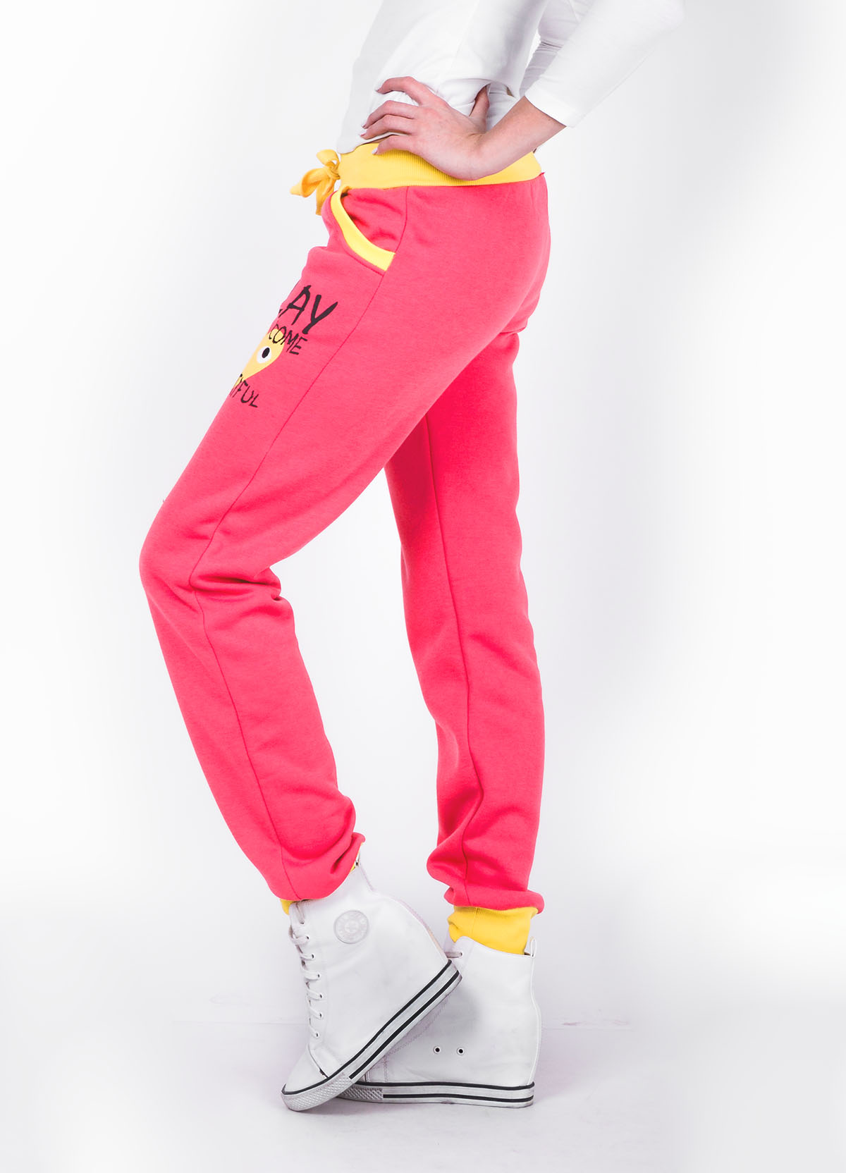 Dresy, ocieplane spodnie, ściągacze na dole, w pasie gumka i sznurek do regulacji, na lewym udzie aplikacja w kontrastowym kolorze, bo bokach kieszenie, pas i ściągacze w kontrastowych kolorach do całości. Materiał 65% bawełna, 35% poliester Modelka wzrost 172cm, na co dzień nosi S/M, rozmiar z prezentacji produktu M