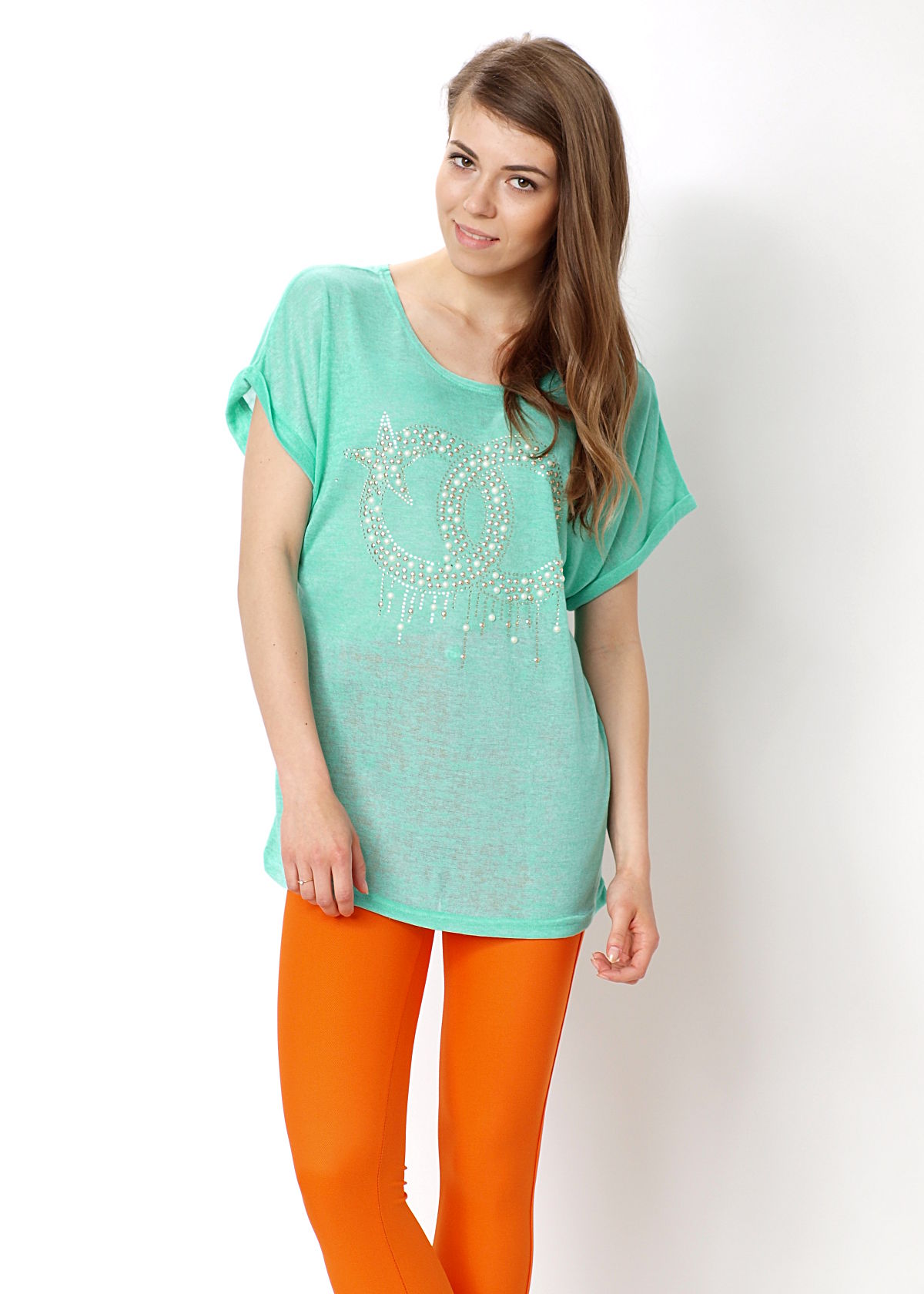 Bluzka z krótkim rękawem. Wykonana z przyjemnego materiału o ciekawej fakturze. Z przodu duża aplikacja z dżetów i perełek. Dekolt okrągły. Rękawki zakończone zakładką. Tunika dobrze układa się na każdej sylwetce. Luźniejszy krój gwarantuje komfort oraz wygodę noszenia. Dostępna w najmodniejszych kolorach sezonu, między innymi neonowych odcieniach, które są hitem tego lata! Skład: 65% bawełna, 35% poliester.Wzrost modelki: 172cmModelka ma na sobie: rozmiar z metki M/LNa co dzień nosi rozmiar: S/M