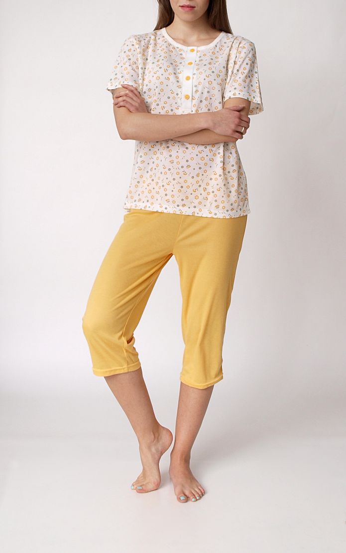 Bawełniana kolorowa piżama. Przyjemny komplet bluzka plus rybaczki. Koszulka z krótkim rękawem w drobne kwiatki. Na dekolcie zapinana za guziczki. Spodnie do łydek, w jednolitym kolorze. W pasie na elastycznej gumce. Bardzo wygodny i komfortowy komplet do spania.Skład: 65% bawełna, 35% poliester.