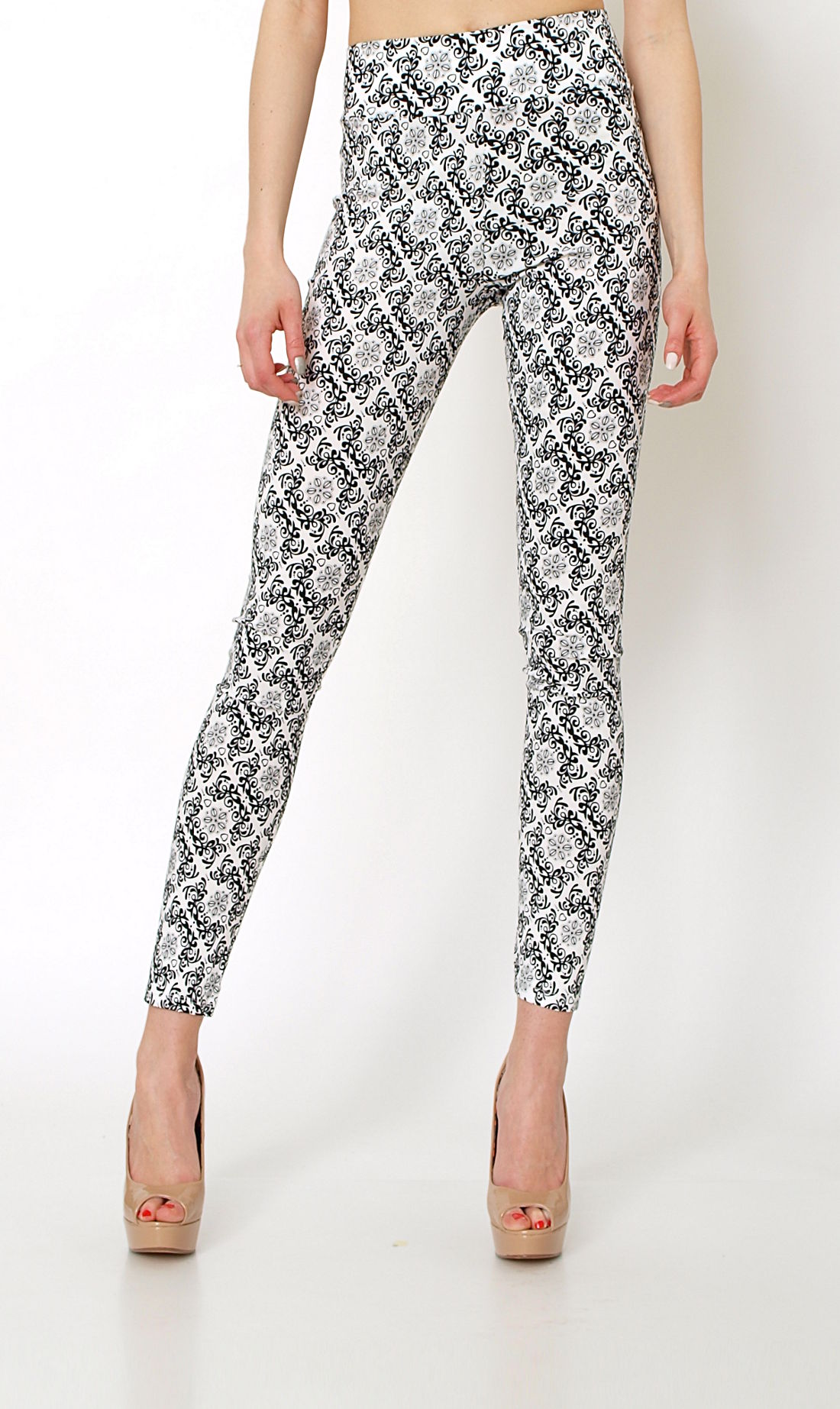 Stylowe spodnie z wysokim stanem. Dopasowane, zupełnie jak legginsy. Elastyczne rurki w niepowtarzalne wzory w stylu retro. W pasie na gumce. Wykonane z dobrej jakości bawełnianego materiału. Ładnie podkreślają sylwetkę. Wygodne i przyjemne w użytkowaniu. Świetnie prezentują się w zestawieniu ze zwiewnymi tunikami, gładkimi topami i koszulkami.Skład: 70% bawełna, 20% poliester, 10% elastan.