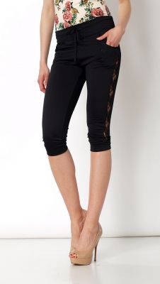 Stylowe rybaczki z lampasami w eleganckim stylu. Czarne spodenki zdobione zmysłową koronką po bokach. Z przodu kieszenie wykończone subtelnie połyskującymi kamyczkami. W pasie regulowane praktycznym sznureczkiem. Nogawki sięgające za kolano, zakończone bezuciskowym ściągaczem. Wykonane z przyjemnego, półmatowego materiału. Na sylwetce prezentują się bardzo gustownie. Idealnie pasują do szpilek, w połączeniu z którymi stworzą modną i bardzo kobiecą stylizację.Skład: 80% poliamid, 15% poliester, 5% elastan.Wzrost modelki: 172cmModelka ma na sobie: rozmiar z metki MNa co dzień nosi rozmiar: S/M