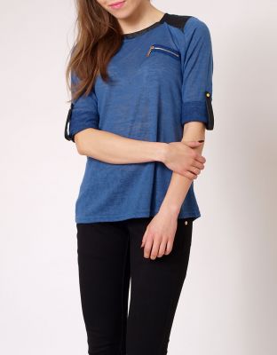 Komfortowa, bardzo przyjemna bluzka z długim rękawem, z możliwością podwinięcia do długości 3/4. Na ramionach czarne, pikowane pagony a`la skóra. Z przodu, na wysokości piersi złoty zamek (imitacja kieszeni). Dekolt wykończony lamówką. Modna, a zarazem niezwykle praktyczna.Skład: 65% bawełna,35% poliester.