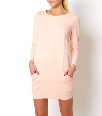 Dzianinowa tunika o kroju lekkiej bombki. Z przodu oryginalnie wszyte kieszenie. Dekolt okrągły, długie rękawy.Materiał: 95% bawełna, 5% elastan. Modelka: wzrost 175 cm, na co dzień nosi S/M, rozmiar z prezentacji produktu UNIWERSALNY.