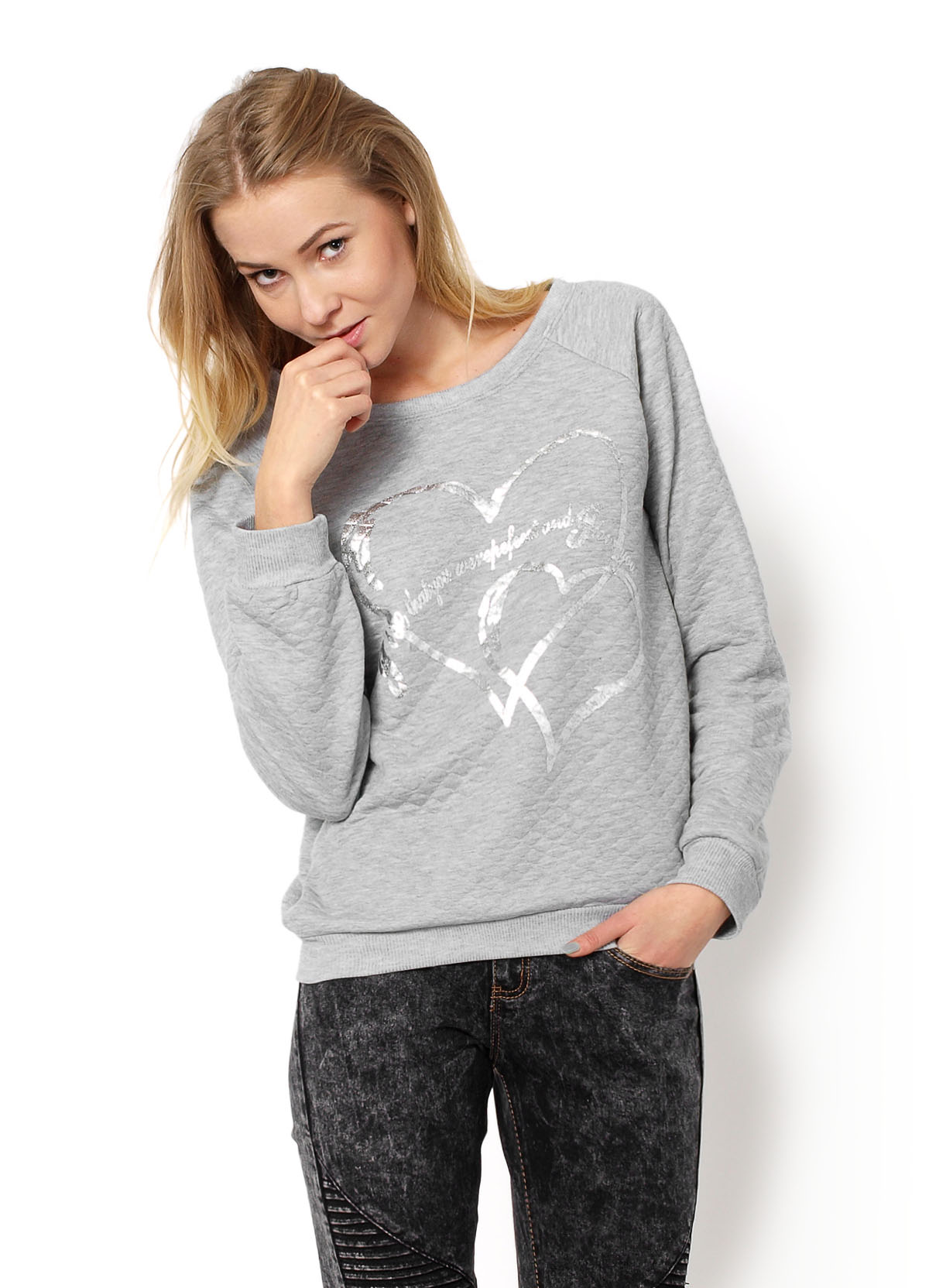 Pikowana bluza, dekolt okrągły, z przodu lśniący nadruk - serca, dół z rękawami wykończony ściągaczem. Materiał 65% bawełna, 35% poliesterModelka wzrost 175cm, na co dzień nosi S/M, rozmiar z prezentacji produktu S/M