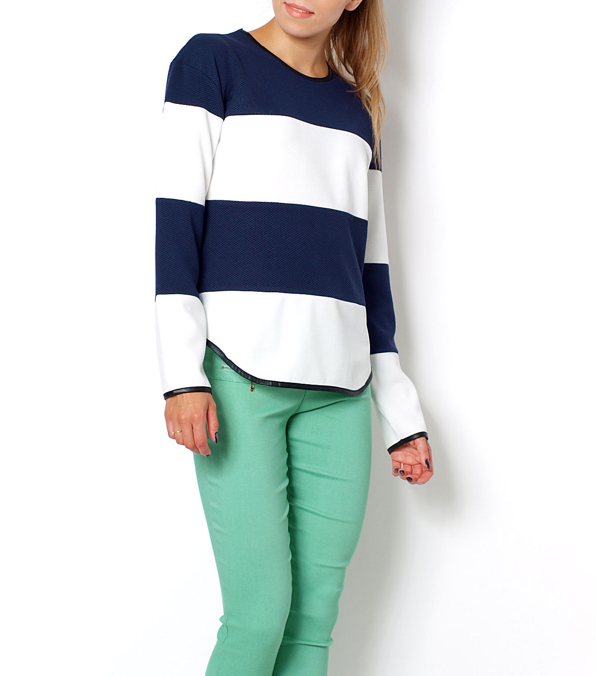 Modna bluzka w szerokie pasy, z długim rękawem. Wykonana z dobrego gatunkwo, pikowanego materiału. Bluzka posiada wykończenia z czarnej lamówki a`la skóra. Asymetryczna - tył delikatnie dłuższy, dzięki czemu świetnie komponuje się w zestawieniu np. z legginsami, czy klasycznymi jeansami. Dzięki luźnemu krojowi, sprawdzi się noszona przez panie o każdym typie sylwetki. Klasyczne kolory do wyboru.Skład: 65% bawełna, 35% poliesterWzrost modelki: 172cm Modelka ma na sobie: rozmiar z metki S/MNa co dzień nosi rozmiar: S