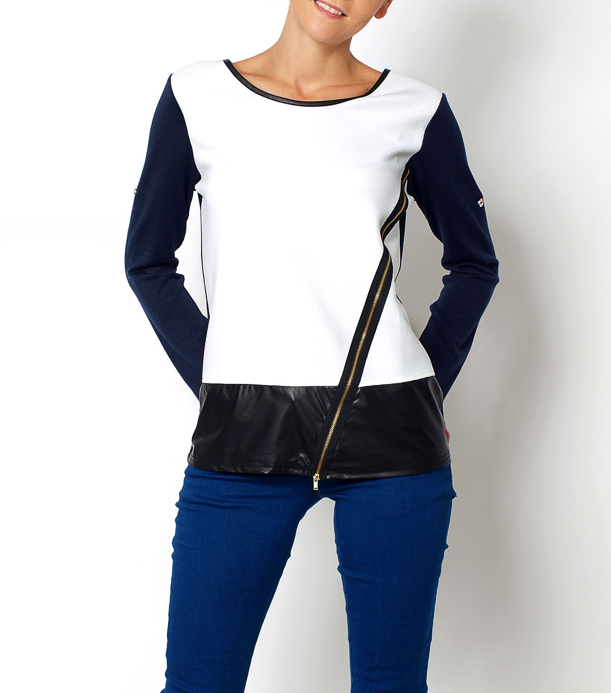 Pikowana bluzka z przodu, z tyłu i na rękawach materiał gładki, długi rękaw, możliwość podpięcia rękawów do 3/4 długości, dekolt okrągły wykończony lamówkę z ekoskóry, z przodu ozdoba w postaci rozpinanego zamka, na dole bluzki szeroka wstawka z ekoskóry.Materiał 65% bawełna, 35% poliester.Modelka wzrost 175cm, na co dzień nosi S/M, rozmiar z prezentacji produktu M.
