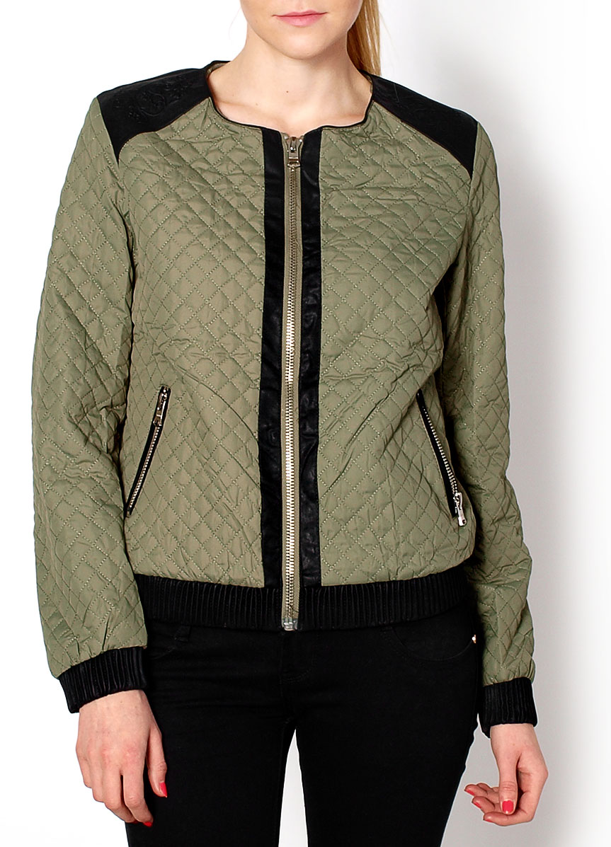 Kurtka zapinana na suwak, klasyczny fason z okrągłym dekoltem. Góra kurtki ze skóry ekologicznej. Ściągacze przy rękawach oraz na dole. Kurtka na podszewce, posiada kieszenie. Materiał: 100% poliester / 60% poliuretan, 40% wiskoza.Modelka: wzrost 175 cm, na co dzień nosi S/M, rozmiar z prezentacji produktu M.