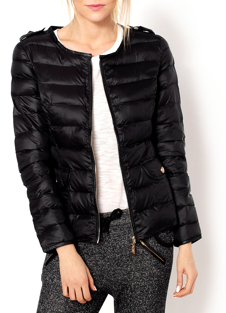 Pikowana kurtka, lekkie wypełnienie, na zamek, z przodu kieszenie zapinane na złote guziki, na ramionach pagony, okrągły dekolt z lamówką z ekoskóry.Materiał 100% nylon / 100% poliesterModelka wzrost 175cm, na co dzień nosi S/M, rozmiar z prezentacji produktu 38/M