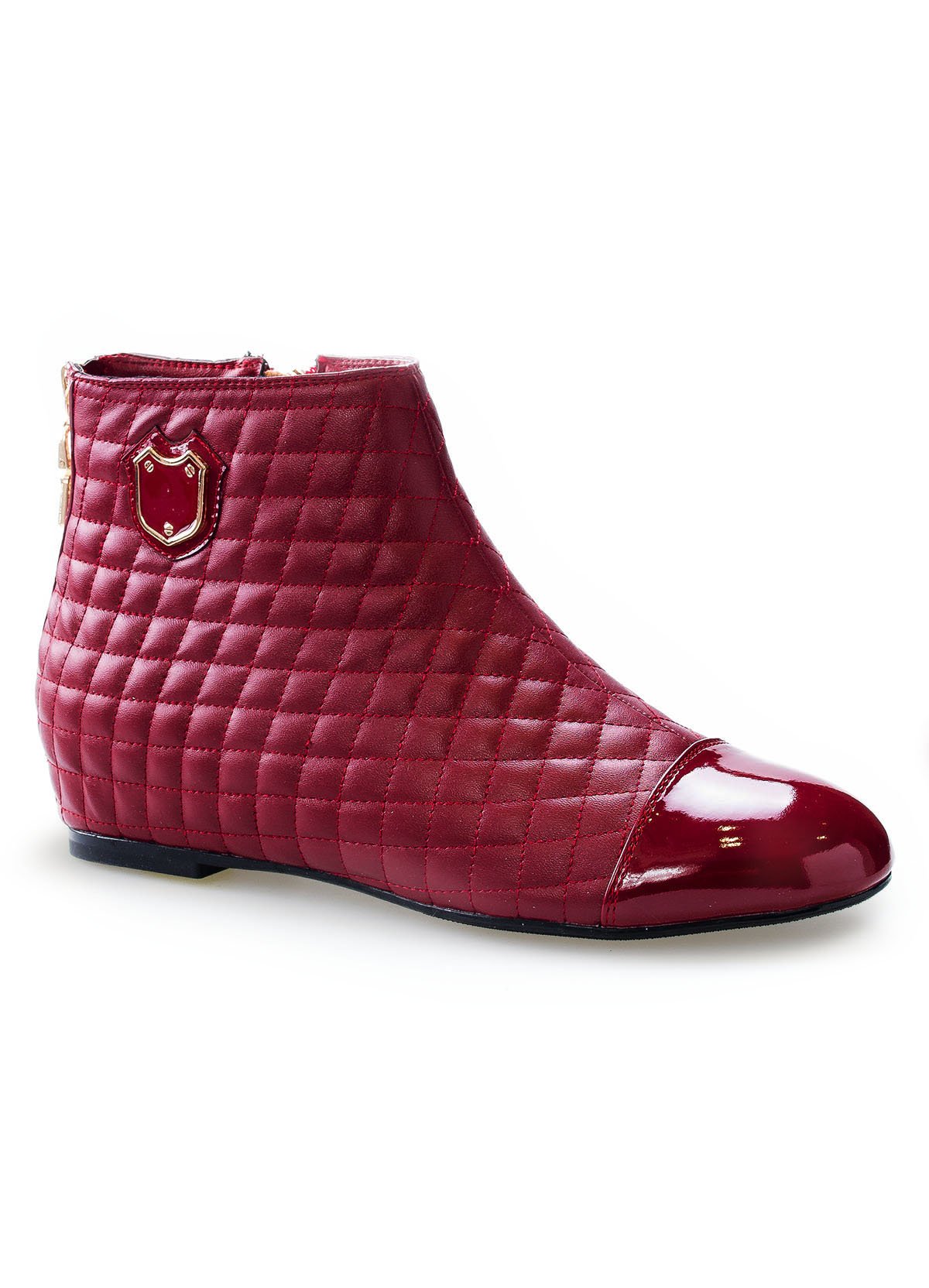 Modne jesienne botki, płaski obcas. Z pikowanej, miękkiej eko skóry. Obcas płaski, noski dodatkowo wzmocnione, lakierowane. Od wewnętrznej strony zapinane na zamek, który ułatwia ich nakładanie i zdejmowanie. Ozdobny suwak w kolorze złotym z tyłu buta, oraz blaszka po zewnętrznej stronie. Wnętrze oraz wkładka wyłożone delikatnym futerkiem. Materiał zewnętrzny: tworzywo skóropodobne. W stylowym odcieniu bordo.Idealne na jesienną porę. Pasują zarówno do spódnic i spodni jak i legginsów.