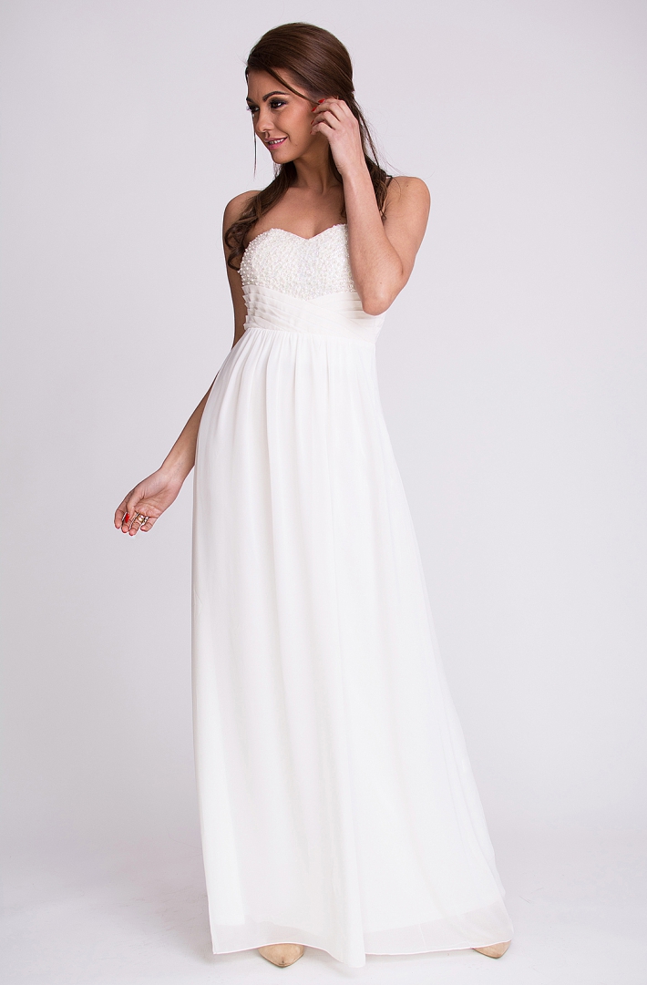 Długa suknia, góra ozdobiona cekinami i koralikami