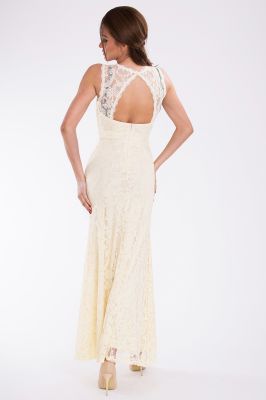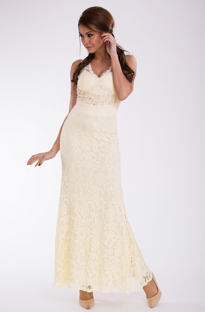 Długa suknia pokryta koronką ozdobiona kamieniami