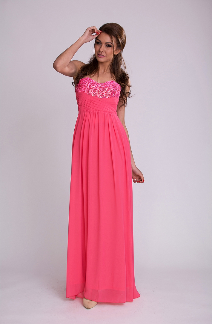 Długa suknia, góra ozdobiona cekinami i koralikami