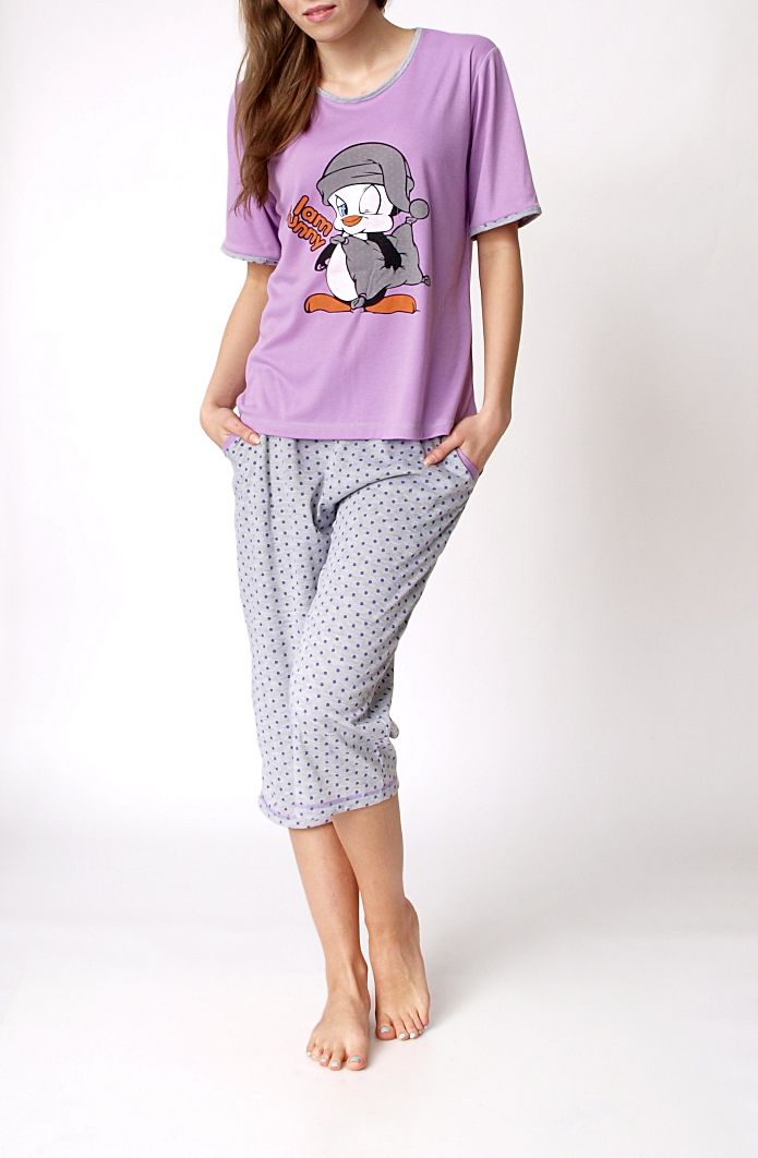 Wygodna, bawełniana piżama. Komplet, rybaczki plus koszulka. Spodnie z nogawkami za kolano. Luźne, przyjemne rybaczki w kolorze szarym, w kropeczki. W pasie na elastycznej gumce, oraz sznureczkiem do regulacji. Koszulka z krótkim rękawem, wykończona lamówką. Z przodu nadruk z kolorowym pingwinkiem. Przyjemny w dotyku materiał.Skład: 100% bawełna