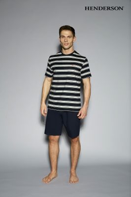 Paski, to deseń, który zawsze dobrze wygląda. Tu granatowo-szare, prezentują się wyjątkowo modnie. T-shirt z krótkim rękawem, dobrze leży. Dzianina przewiewna, pozwala świetnie wypocząć. W zestawie spodnie na gumce, granatowe, gładkie. Idealny zestaw dla lato. Wskazówki: sugerowane pranie w temp. nie wyższej niż 30 stop., prasować na lewej stronie w temp. nie wyższej niż 110 stop, nie suszyć w suszarce bębnowej, nie czyścić chemicznie.