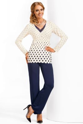 Wygodna, dwuczęściowa piżama w małe groszki. Duet kolorystyczny: ecru i granat, idealnie do siebie pasują. Bluzeczka przy dekolcie posiada koronkowe obszycie, które wygląda bardzo elegancko. Spodnie gładkie, na gumce, bardzo praktyczne. Skład: 95% wiskoza, 5% elastan.