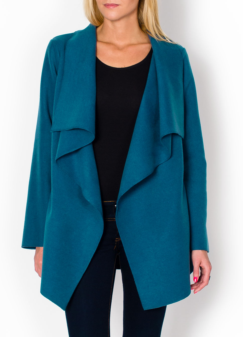 Praktyczny płaszczyk, wygodny i niesamowicie efektowny. Wykonany z ciepłej, flauszowej tkaniny, która świetnie ochroni przed pierwszymi chłodami. Luźny oversizowy fason, wiązany w talii. Po bokach funkcjonalne, wsuwane kieszenie. Wyjątkowy kołnierz typu waterfall tworzy modne wykończenie całości.Idealny na jesienny sezon, na chłodniejszą pogodę oraz jako niezbędna część kobiecej garderoby.Materiał FlauszModelka wzrost 175cm, na co dzień nosi rozmiar S/M
