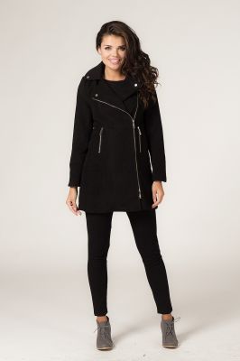 Prosty, czarny płaszcz o ramoneskowym kroju zapinany na dwustronny zamek. Z przodu dwie kieszenie. Przy kołnierzu ozdobne napy. Rękawy wykończone zamkami. Płaszcz posiada podszewkę.
