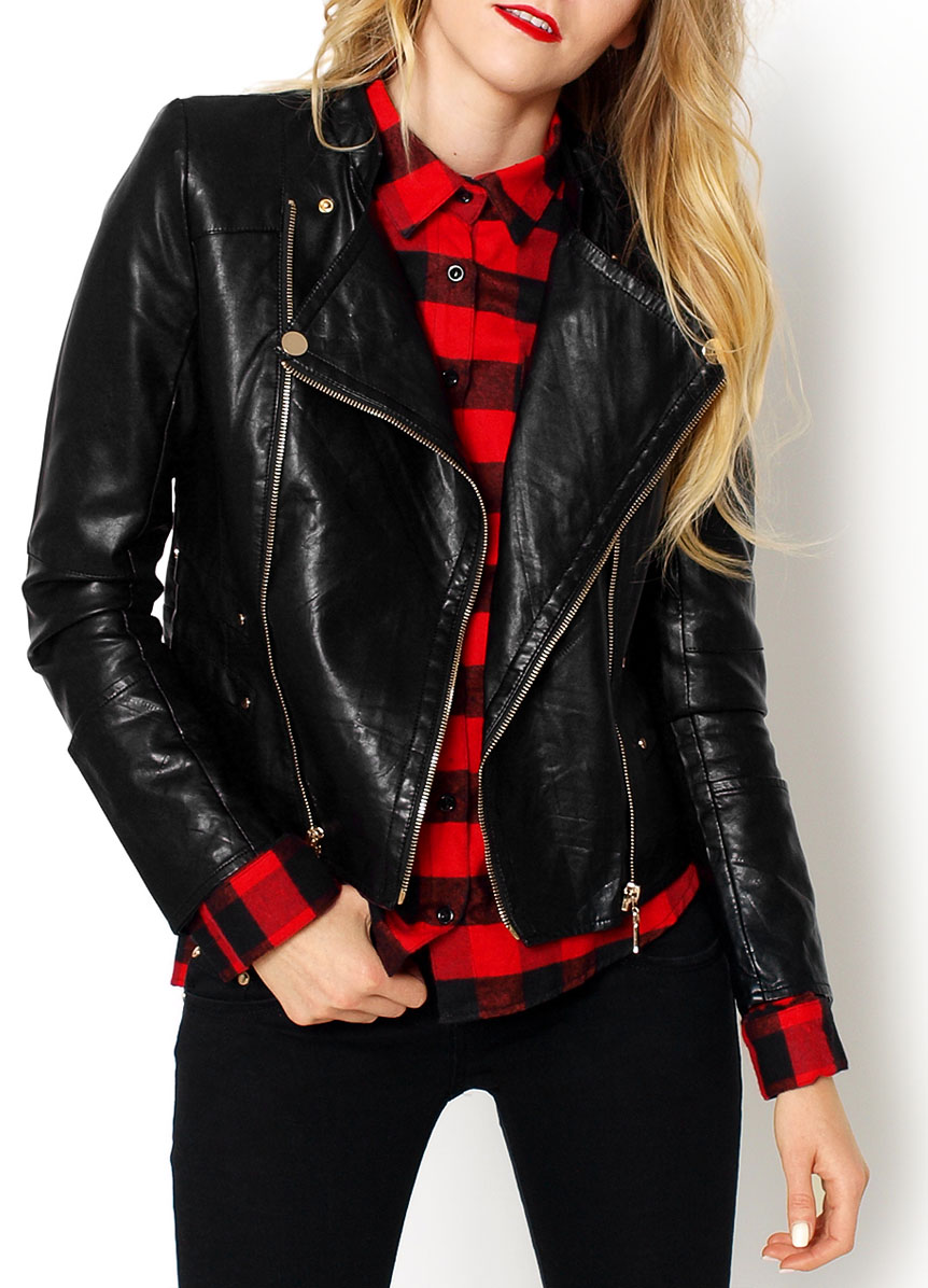 Ramoneska, z ekoskóry, dwurzędowa z kołnierzem, taliowana, tył lekko krótszy, oprócz kołnierza stójka, z przodu imitacje kieszeni, przy rękawach mankiety z ozdobnymi guzikami, od wewnątrz podszewka.Materiał eko skóra (70% P.U, 30% poliester) podszewka - 100% poliesterModelka wzrost 175cm, na co dzień nosi S/M, rozmiar z prezentacji produktu 38(M)