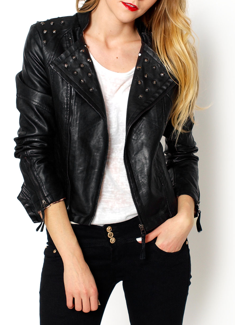 Kurtka ze skóry ekologicznej. Miękka ramoneska zapinana na suwak. Oryginalny kołnierz oraz ramiona przyozdobione dżetami. Na przodzie imitacja kieszeni. Całość na podszewce. Tył lekko krótszy.Materiał: ekoskóra (70% P.U, 30% poliester), podszewka - 100% poliester.Modelka: wzrost 175 cm, na co dzień nosi S/M, rozmiar z prezentacji produktu 38.