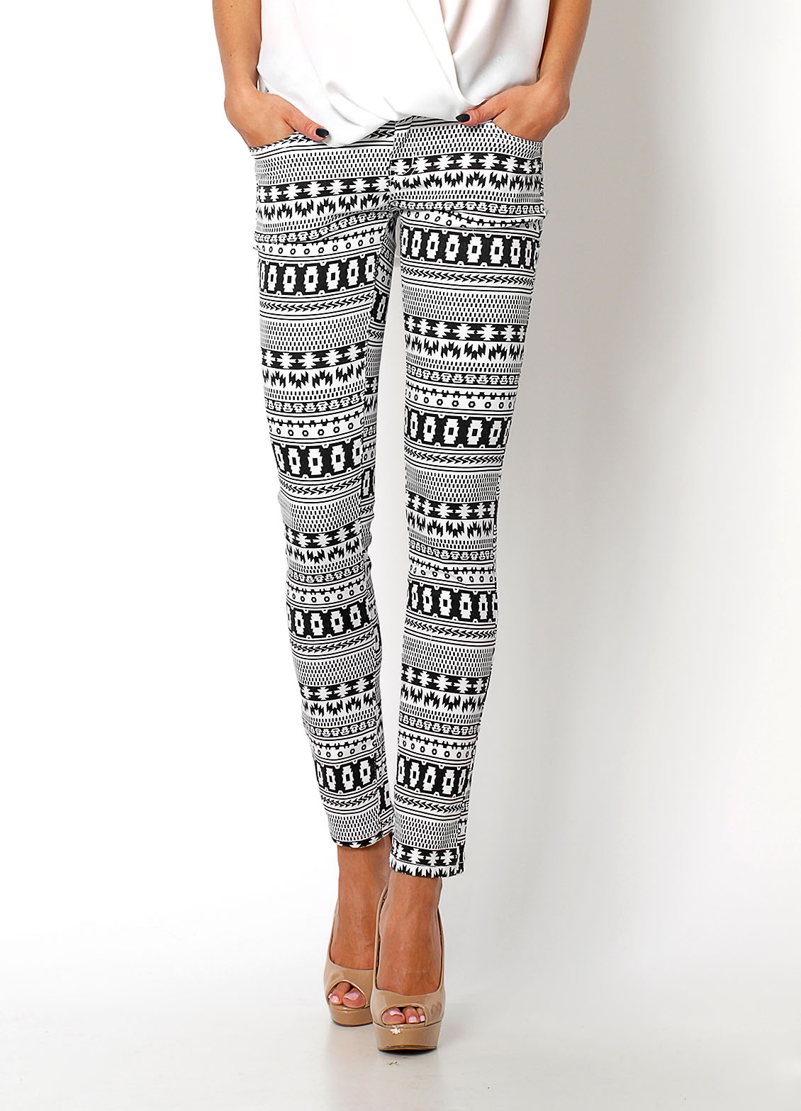 Spodnie/rurki aztecki wzór, elastyczny materiał, kieszenie z przodu i z tyłu, w pasie szlufki, zapinane na guzik i zamek, wykończenie kieszeni złotymi nitami.Materiał 70% bawełna, 27% poliester, 3% elastan.Modelka wzrost 172cm, na co dzień nosi S/M, rozmiar z metki 28/29