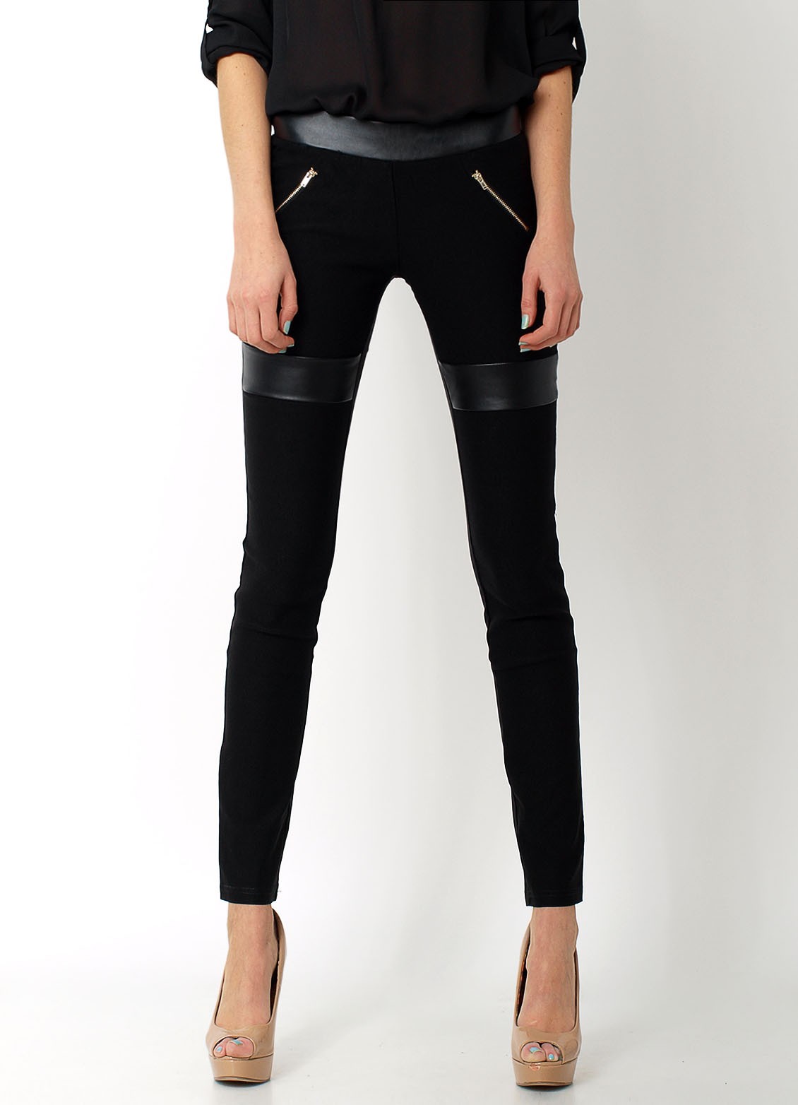 Rurki czarne, elastyczny materiał, w pasie i na udach wstawki z ekoskóry, z przodu zamki imitujące kieszenie.Materiał 68% rayon (sztuczny jedwab), 26% poliamid, 6% elastan.Modelka wzrost 175cm, na co dzień nosi S/M, rozmiar z prezentacji produktu M