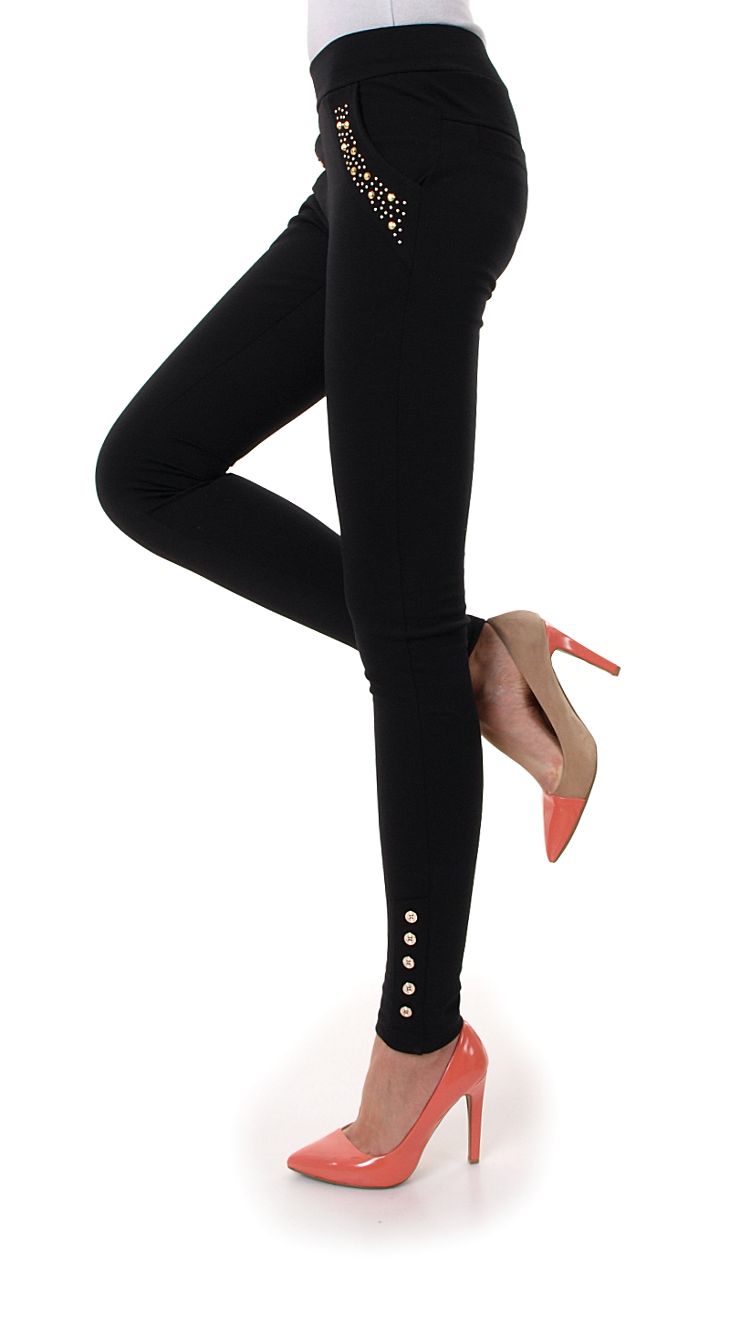 Modne czarne rurki. Czarne spodnie z kieszeniami z przodu, z delikatnie połyskującymi dżetami. Na nogawkach ozdobne butony. W pasie elastyczna gumka. Na pośladkach imitacja kieszeni. Bardzo komfortowe spodnie, wygodne zupełnie, jak legginsy, a zarazem bardzo stylowe i eleganckie. Ładnie wysmuklają sylwetkę. Świetnie sprawdzą się w wielu stylizacjach.Skład: 65% bawełna, 35% poliester.