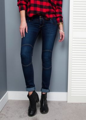 Spodnie jeans, fason rurki, zapinane na zamek i dwa guziki, w pasie szlufki, wokół kolan poziome przeszycia, kieszenie wsuwane z przodu i z tyły wykończone nitami.Materiał 90% bawełna, 10% elastan.Modelka wzrost 175cm, na co dzień nosi S/M, rozmiar z prezentacji produktu 28