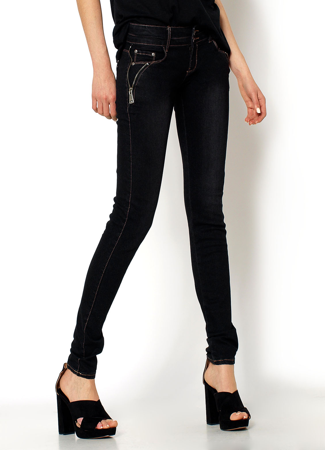 Rurki jeansowe, odcień czerni, lekkie przetarcia, zapinane na zamek i dwa guziki, w pasie szlufki, kieszenie wsuwane z przodu i z tyłu, bo bokach ozdobne zamki, kontrastowa nić.Materiał 95% bawełna, 5% elastan.Modelka wzrost 175cm, na co dzień nosi S/M, rozmiar z prezentacji produktu M/38