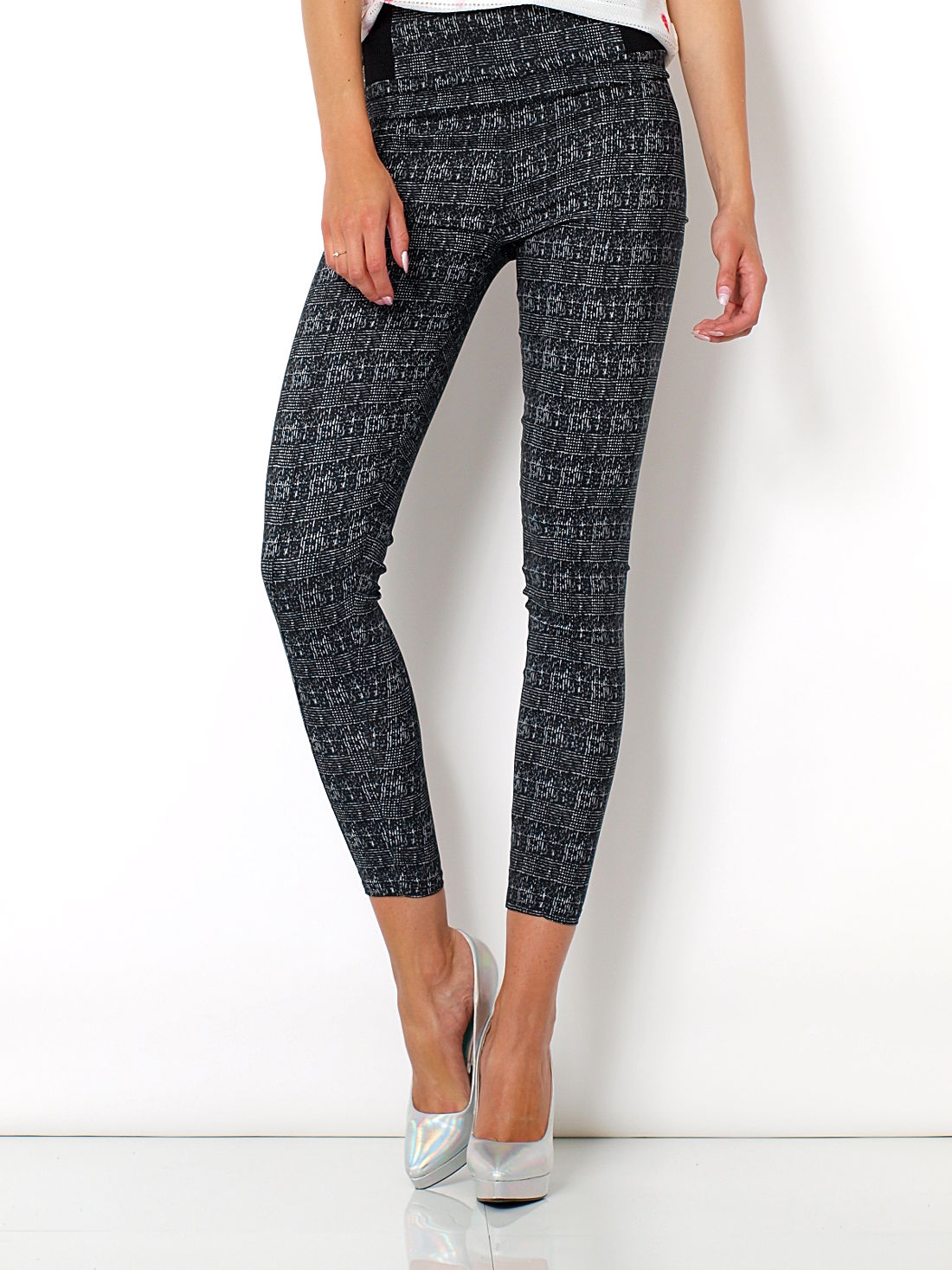 Niepowtarzalne spodnie w kratkę. Modne spodnie typu rurki z wyższym stanem. Wykonane z elastycznego, świetnie dopasowującego się materiału. Doskonale optycznie wysmuklą sylwetkę oraz podkreślą wszystkie atuty figury. Szeroki pas, wzmocniony po bokach szeroką gumą, doskonale zamaskuję brzuszek. Na pośladkach kieszenie. Z przodu na nogawkach pionowe przeszycia. Niebanalna wzór kratki przykuwa uwagę, a przede wszystkim nigdy nie wychodzi z mody! Kolor czarny.Skład: 70% bawełna, 25% nylon, 5% spandex. Wzrost modelki: 172cmModelka ma na sobie: rozmiar z metki S/MNa co dzień nosi rozmiar: S/M