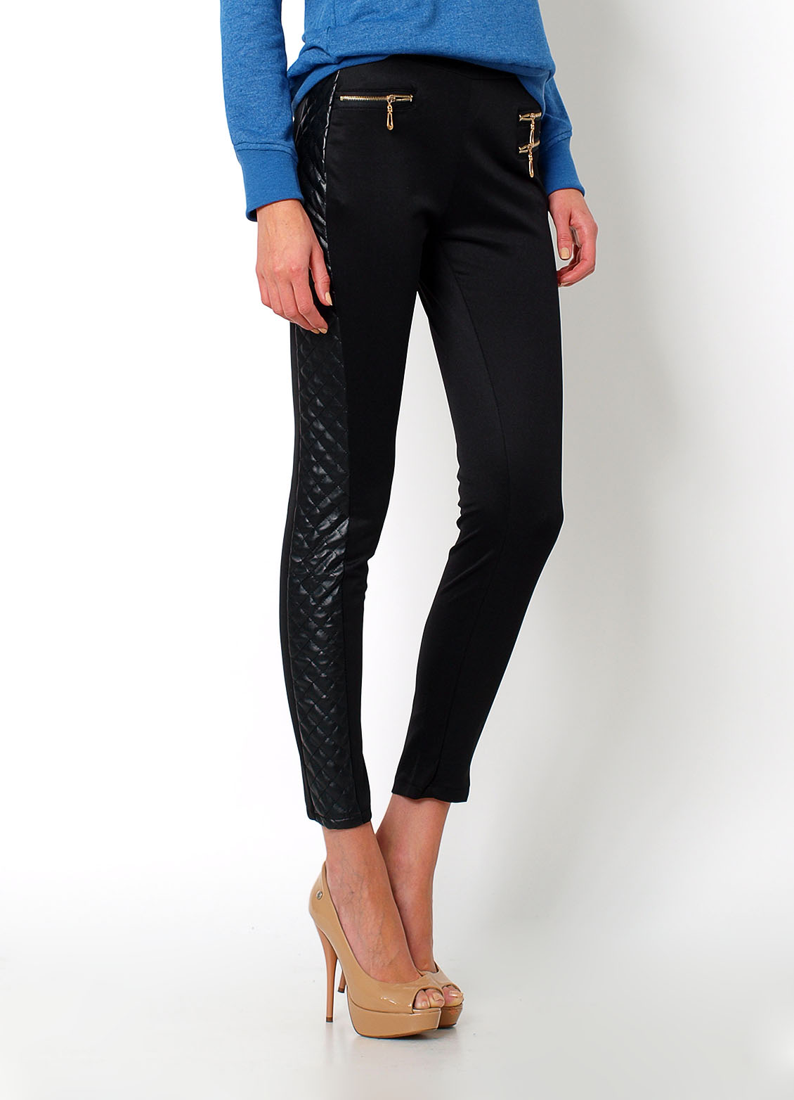 Rurki materiał półmatowy, pikowane lampasy z ekoskóry, z przodu złote ozdobne zamki.Materiał 100% poliester. Modelka wzrost 175cm, na co dzień nosi S/M, rozmiar z prezentacji produktu M