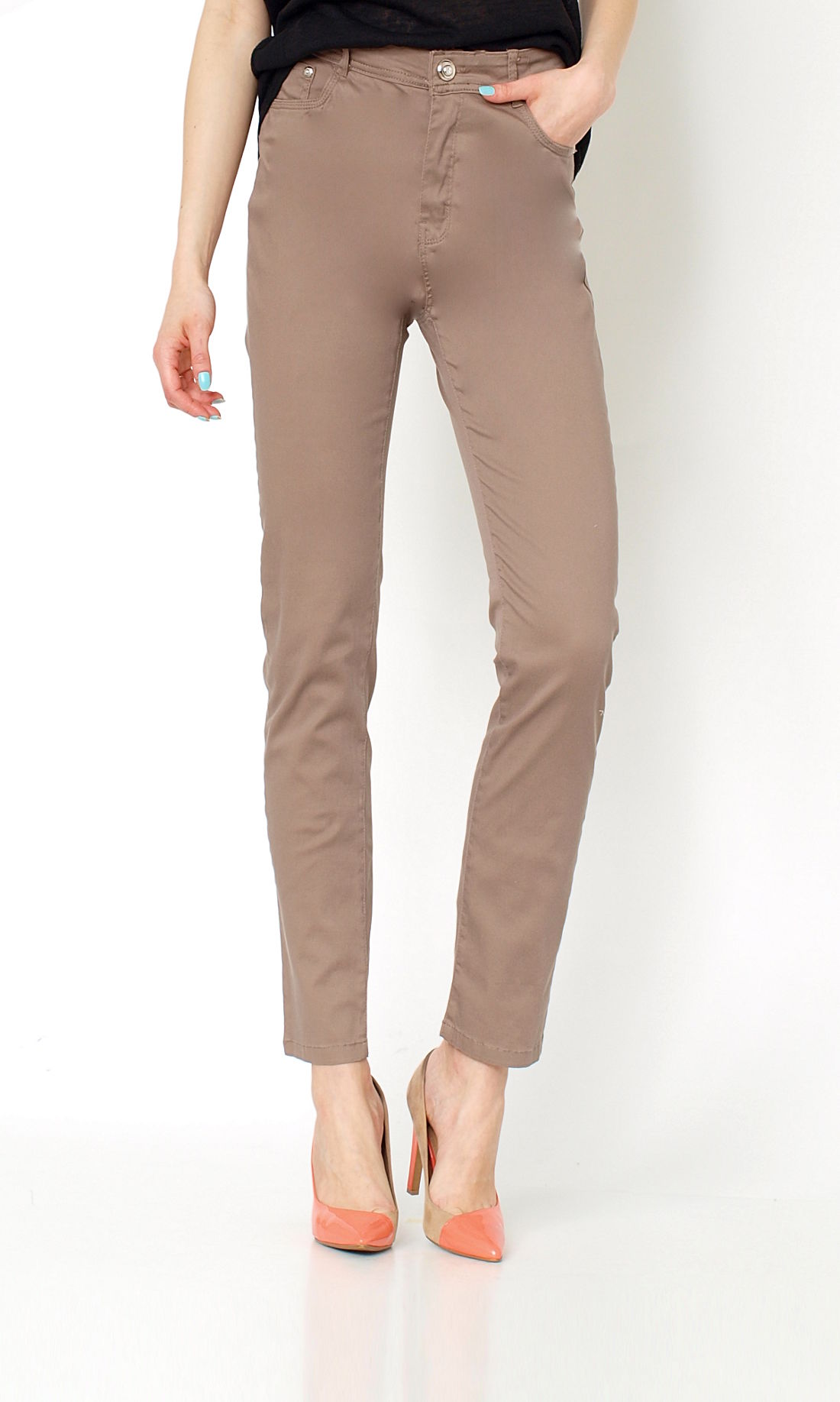 Spodnie z wysokim stanem o klasycznym, prostym kroju. Nogawki delikatnie zwężane. Zapinane na zamek i guzik. Z przodu i z tyłu kieszenie wykończone nitami. Z tyłu zdobione delikatnym, wyszywanym wzorem i cyrkoniami. W pasie szlufki. Wykonane z materiału dobrej jakości. Dobrze układają się na sylwetce. Bardzo praktyczne oraz zawsze modne. Skład: 65% bawełna, 30% poliester, 5% elastan