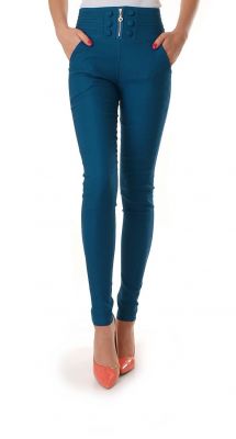 Wyszczuplające spodnie z wysokim stanem. Wewnątrz ocieplane przyjemnym meszkiem. Elastyczne rurki z kieszeniami z przodu. W pasie na szerokiej gumce. Dodatkowo pas zdobiony poziomymi przeszyciami, guzikami oraz modnym, złotym zamkiem. Świetnie dopasowują się do sylwetki. Skład: 35% bawełna, 65% poliester.