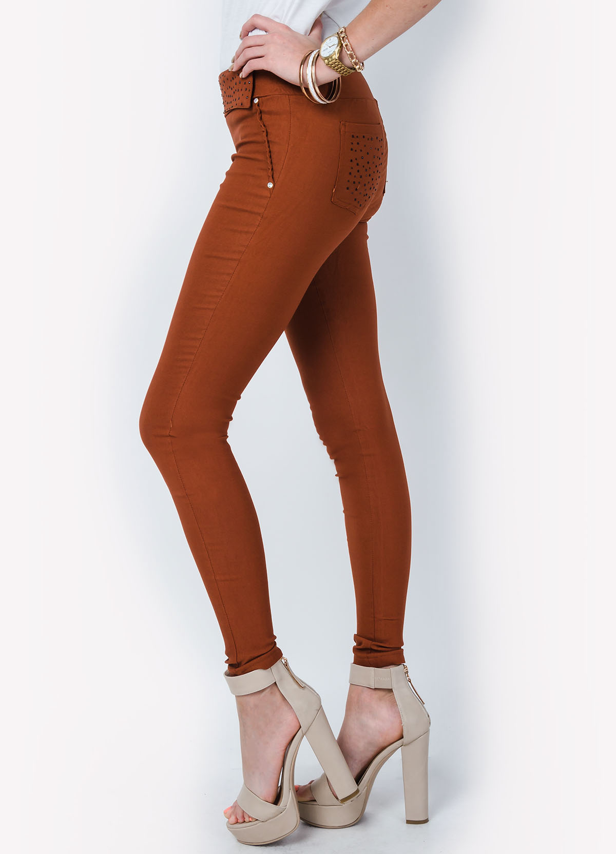 Spodnie elastyczne, jak legginsy czy tregginsy, rurki z wyższym stanem i dżetami w pasie i na kieszonkach. Wykonane z elastycznego materiału, który dobrze dopasuje się do ciała. Podwyższony stan, w pasie guma. Z przodu wszyty pasek ozdobiony dżetami. Z przodu imitacja kieszonek, z tyłu wsuwane kieszonki ozdobione dżetami. Wewnątrz materiał przyjemny w dotyku. Modne kolory do wyboru.Dopasowane spodnie materiałowe to klasyka w damskiej garderobie, a urozmaicenie modnym detalem przyciągnie spojrzenia. Ładnie wymodelują sylwetkę. Klasyczny fason i ciekawe kolory pozwolą na dobór dowolnych dodatków i dopasują się do każdego stylu, są idealne na każdą porę roku. Uniwersalne spodnie, pasujące do każdego stylu i na każdą okazję.Materiał 65% bawełna, 35% poliesterModelka wzrost 175cm, na co dzień nosi S/M