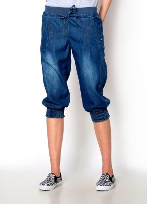 Rybaczki jeansowe, luźny fason, w pasie gumka oraz sznurek do regulacji, z przodu i z tyłu wsuwane kieszenie, z przodu imitacja rozporka, nogawki zakończone ściągaczem, całość wykończone kontrastową nicią. Materiał 100% bawełnaModelka wzrost 175cm, na co dzień nosi S/M, rozmiar z prezentacji produktu M