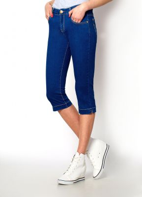 Rybaczki jeansowe, zapisane na zamek i guzik, w pasie szlufki, z przodu i z tyłu kieszenie, przy zakończeniu nogawek rozcięcia po bokach, wykończenie nicią w kontrastowym kolorze. Materiał 95% bawełna, 5% lycraModelka wzrost 175cm, na co dzień nosi S/M,