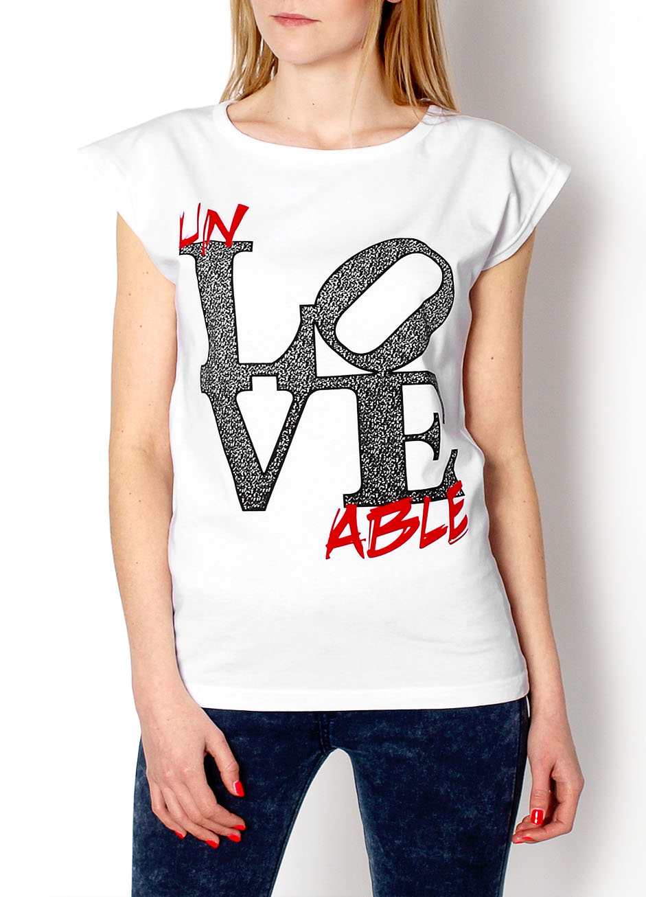 Bluzka z krótkim rękawem, okrągły dekolt, nadruk z przodu.Materiał : 100% bawełna.Modelka : 175cm, na co dzień nosi S/M, rozmiar z prezentacji produktu S.