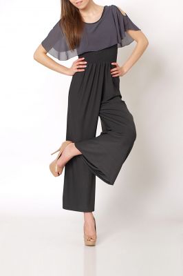 Wyjątkowy kombinezon bez rękawów. Niepowtarzalny, kobiecy fason w romantycznym stylu. Oryginalny kombinezon z rozszerzanymi, zwiewnymi nogawkami. Góra ładnie dopasowana, zdobiona szyfonową falbanką z seksownymi rozcięciami na ramiona. Dzięki szerokiej, drapowanej gumce w talii rewelacyjnie podkreśla sylwetkę. Wykonany z przyjemnego, elastycznego materiału. Dekolt okrągły. Niebanalna, efektowna i niezwykle modna propozycja, ideala na specjalne okazje.Skład: 35% bawełna, 65% poliester.