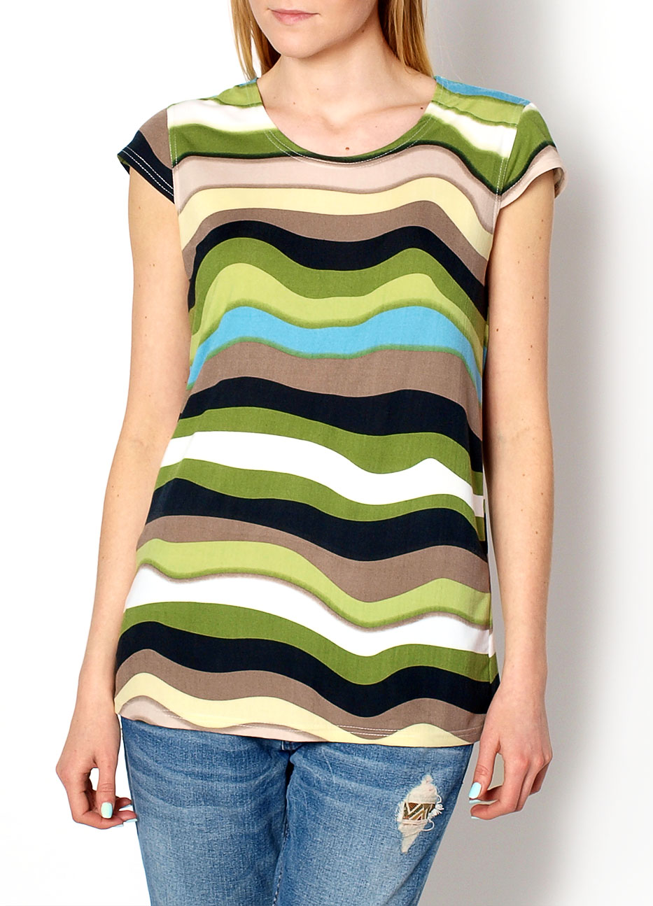 Koszula/t-shirt w kolorowe, nieregularne paski, dekolt okrągły, krótki rękawek, miękki materiał.Materiał 65% bawełna, 35% poliester.Modelka wzrost 175cm, na co dzień nosi S/M, rozmiar z prezentacji produktu M