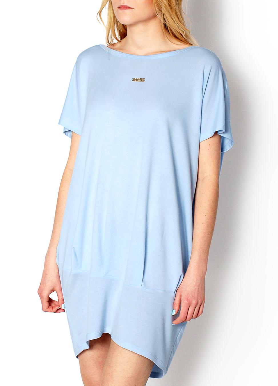 Tunika z krótkim rękawem, zapinana na plecach na suwak w złotym kolorze, dekolt okrągły, lekko zwężana ku dołowi.Materiał : 92% TC (bawełna + poliester), 8% spandex.Modelka : 175cm, na co dzień nosi S/M, rozmiar z prezentacji produktu S.