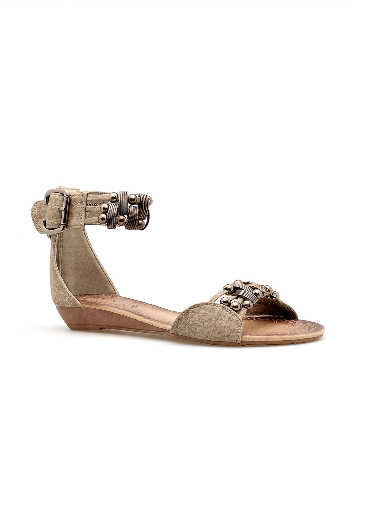 Sandały na lekkiej koturnie z zabudowaną piętą. Zapinane na kostce. Całość zdobiona koralikami.