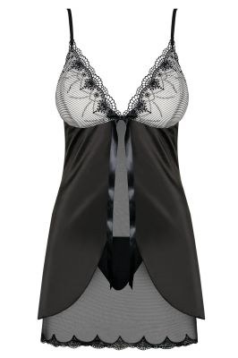 Kusząca, dwuwarstwowa koszulka uszyta z delikatnego tiulu oraz jedwabistej satyny. Miękkie miseczki zdobiono wyrafinowanym haftem i gipiurową falą ? perfekcyjnie uzupełniające się detale! Na środku między miseczkami figlarna kokarda. Otulana tak piękną koszulką poczujesz się wyjątkowo, a dzięki zwiewnej satynowej warstwie, swobodnie. W komplecie gładkie stringi. Jeżeli komfortowo czujesz się w figach polecamy majteczki Greyla, które niewątpliwie spełnią Twoje oczekiwania.