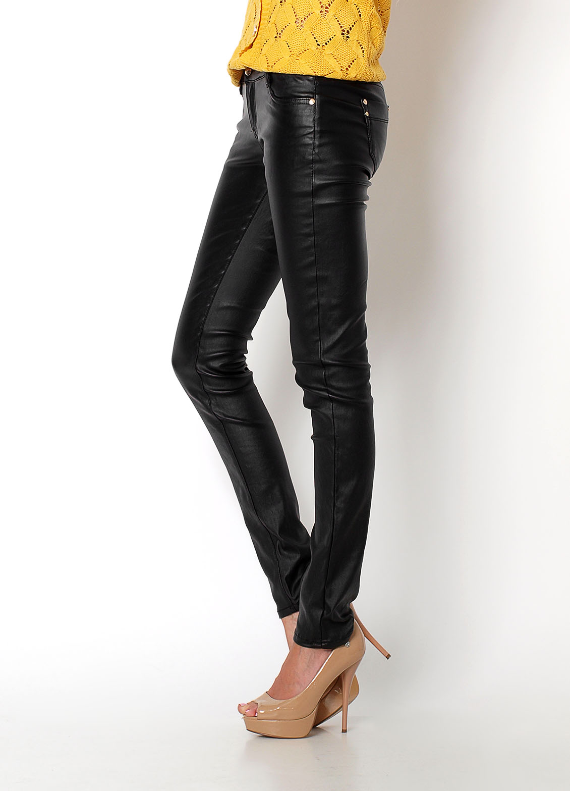 Czarne rurki/spodnie, materiał ekoskóra, zapinane na guzik i zamek, w pasie szlufki, kieszenie z przodu i z tyły wykończone nitami.Materiał 95% bawełna, 5% spandex. Modelka wzrost 172cm, na co dzień nosi S/M, rozmiar z prezentacji produktu M/38.